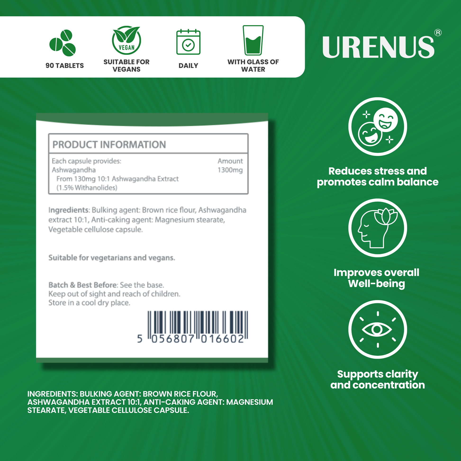 Support your mind and body naturally with Urenus Ashwagandha 1300mg — a premium herbal supplement designed to reduce stress, enhance energy, and promote overall well-being. Each capsule contains potent Ashwagandha extract (Withania somnifera) standardized for active withanolides, helping support calm balance, focus, and vitality.