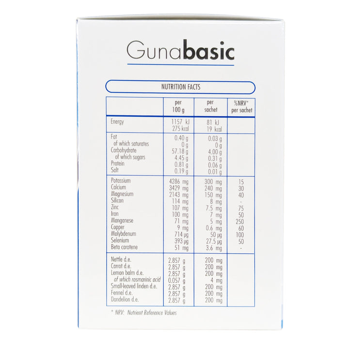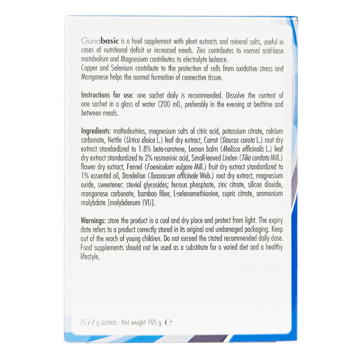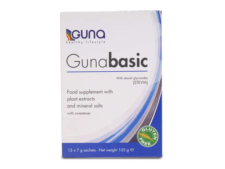 Gunabasic contains a mix of selected components, including mineral salts, beta-carotene and plant extracts, known for their draining and detoxifying action. A balanced acid-base equilibrium is essential for the body's homeostasis and for maintaining well-being over time.