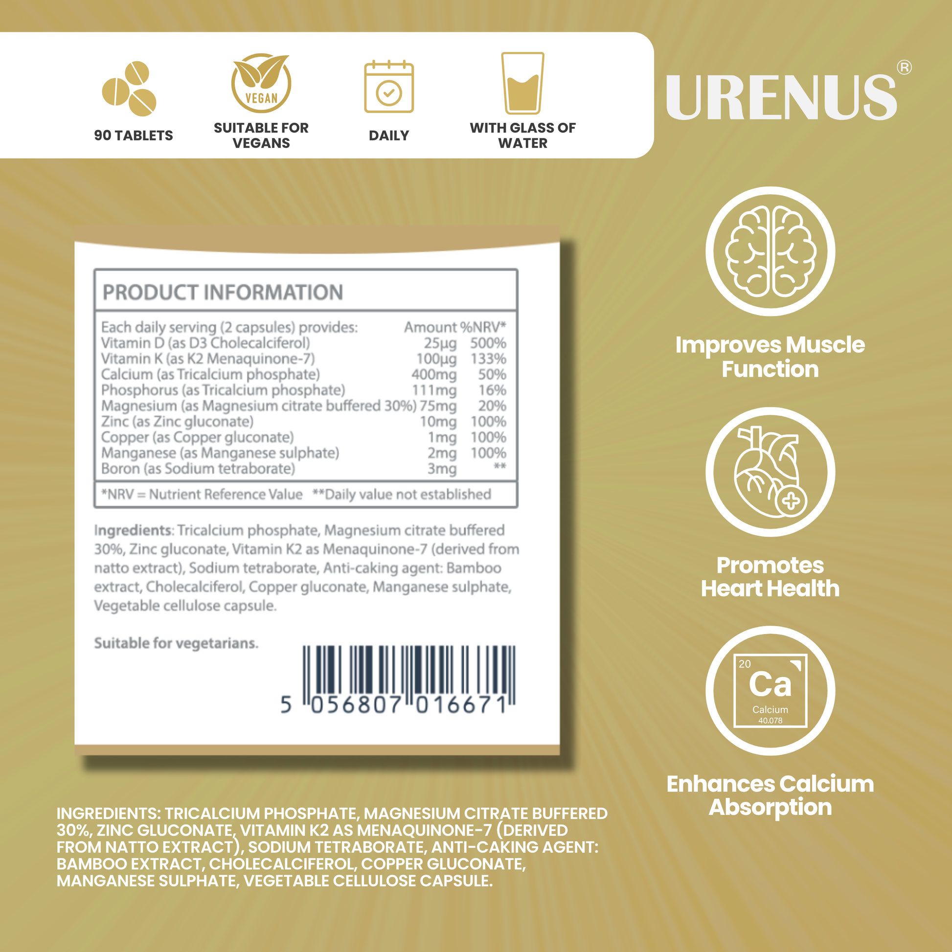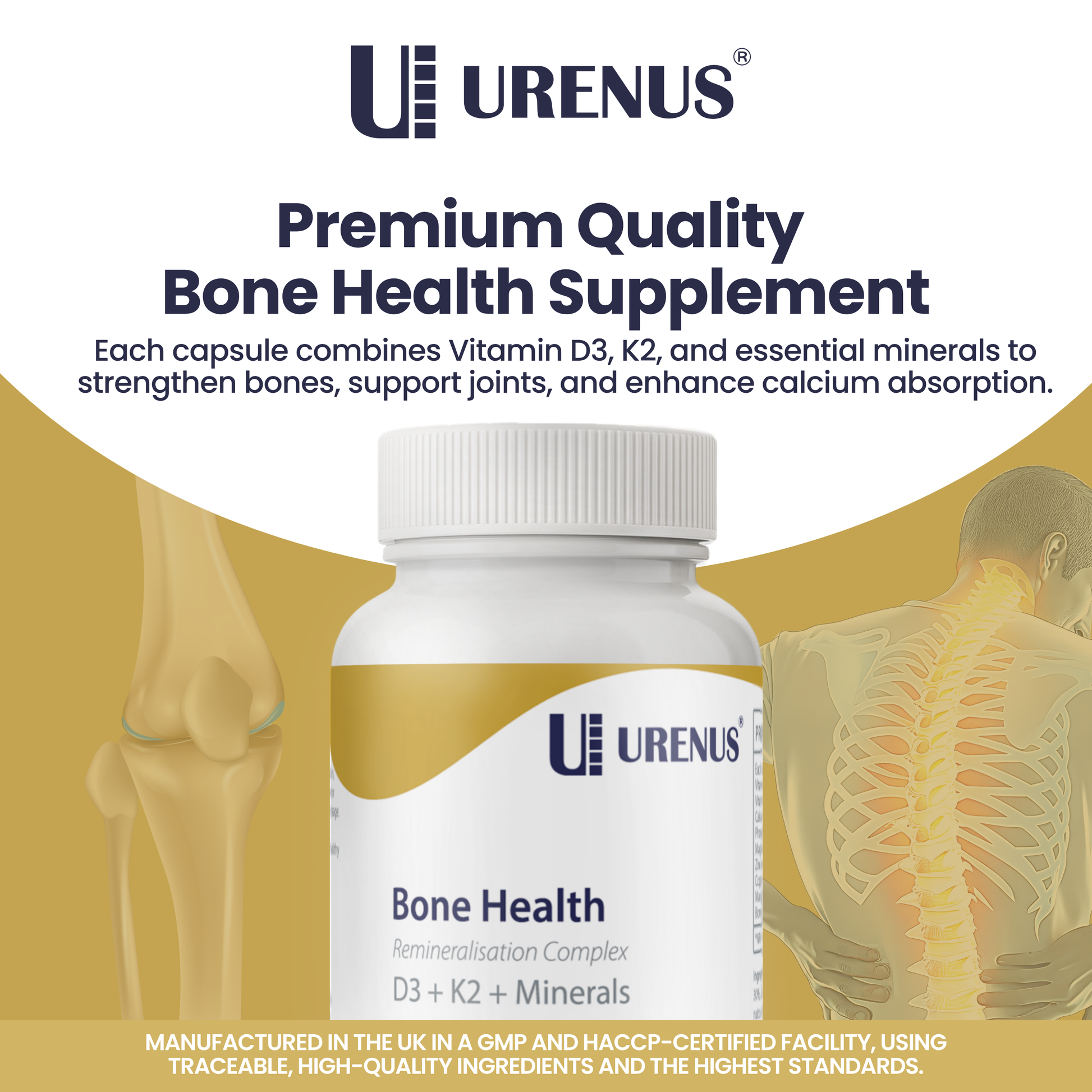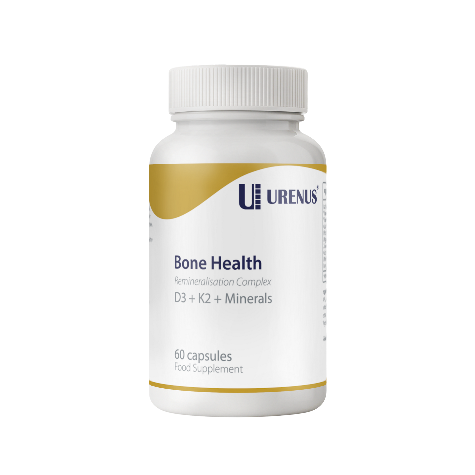 Support strong bones, muscles, and overall wellbeing with Urenus Bone Health. Each capsule is formulated with a powerful combination of Vitamin D3, Vitamin K2, and essential minerals to promote calcium absorption, maintain bone density, and improve muscle function. This daily supplement also helps support heart health and boosts immunity for optimal long-term vitality.