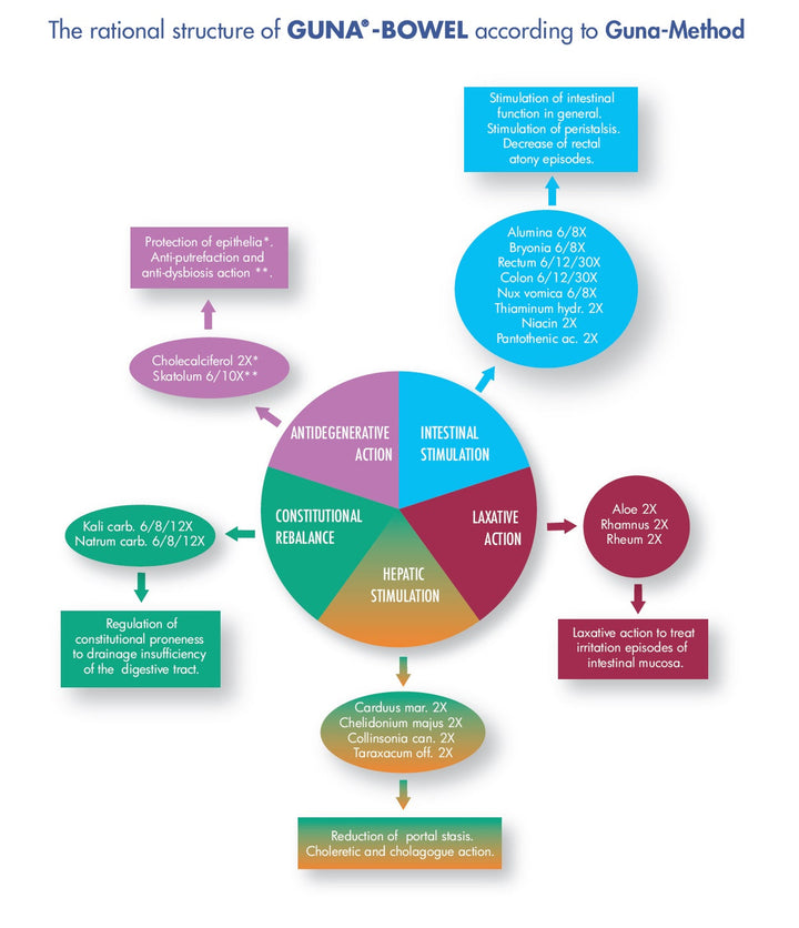 Aloe socotrina 2X, Alumina 6X/8X, Bryonia alba 6X/8X, Carduus marianus 2X, Chelidonium majus 2X, Cholecalciferol 2X, Collinsonia canadensis 2X, Colon, Porcine 6X/12X/30X, Kali carbonicum 6X/8X/12X, Natrum carbonicum 6X/8X/12X, Niacin 2X, Nux vomica 6X/8X, Pantothenic acid 2X, Rectum, Porcine 6X/12X/30X, Rhamnus frangula 2X, Rheum 2X, Skatolum 6X/10X, Taraxacum officinale 2X, Thiaminum hydrochloricum 4X