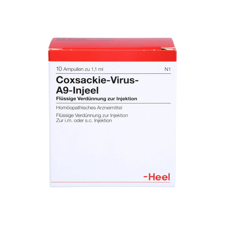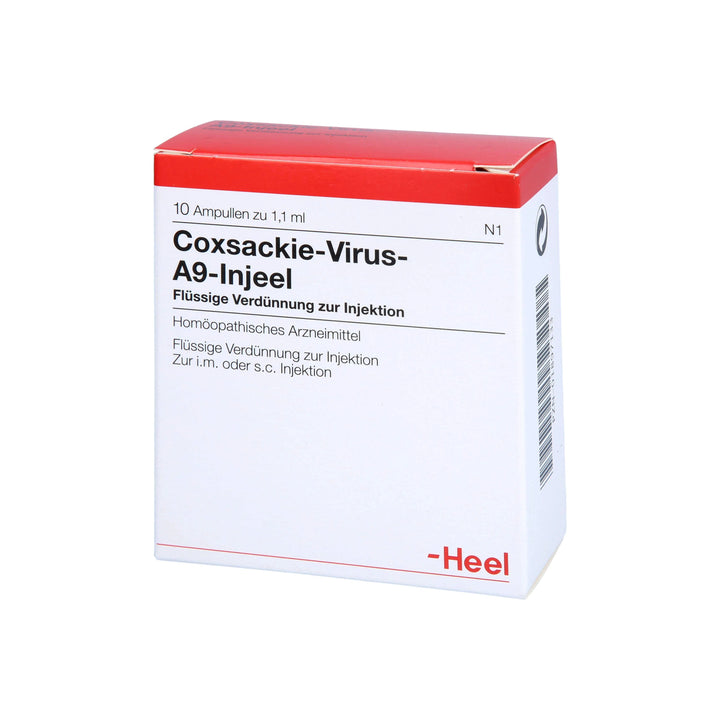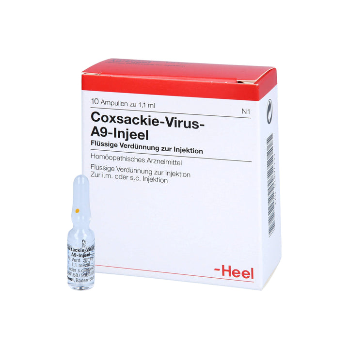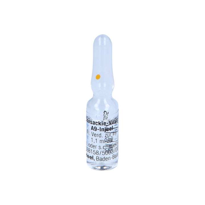 Indications: Coxsackie-Virus-A9-Injeel has proved especially valuable in enteric diseases, e.g. gastro-intestinal affections such as gastritis, duodenitis, and particularly, colitis mucosa et ulcerosa (the optimum treatment is by local in the twentieth point of the colon, which lies in the nasolabial sulcus); colon irritabile, chronically recurrent intestinal infections; further, affections of the urinary passages such as cystopyelitis, urethritis, cystalgia, prostatitis, epididymitis, sinusitis, conjunctivitis, laryngitis, sinobronchial syndrome, bronchial asthma.