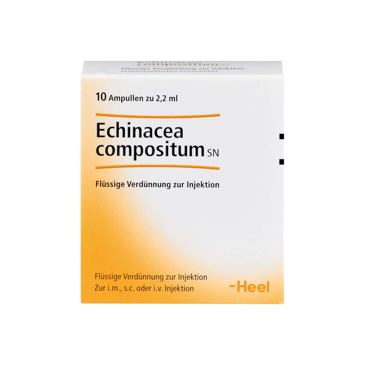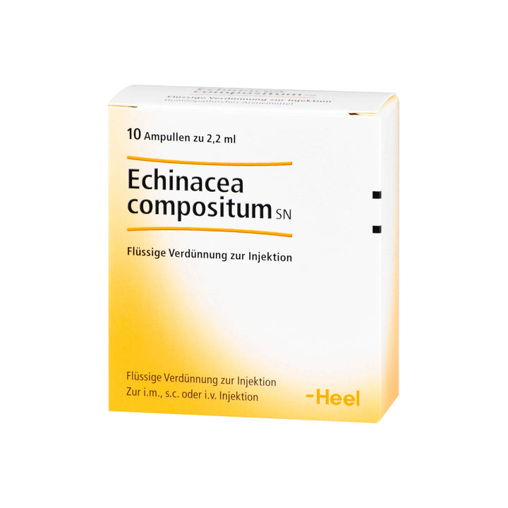 Echinacea compositum ad us. vet. Solution: 1 ampoule of 5.0 ml contains: Echinacea angustifolia D3 0.5 ml; Aconitum napellus D4 0.1 ml; Sulfur D8 0.1 ml; Lachesis mutus D10 0.1 ml; Bryonia cretica D6 0.1 ml; Mercurius sublimatus corrosivus D6 0.1 ml; Phosphorus D8 0.1 ml; Arnica montana D6 0.1 ml.
