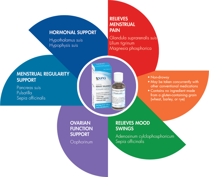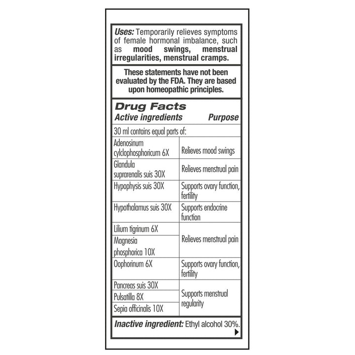 Temporarily relieves symptoms of female hormonal imbalance, such as mood swings, menstrual irregularities, menstrual cramps.