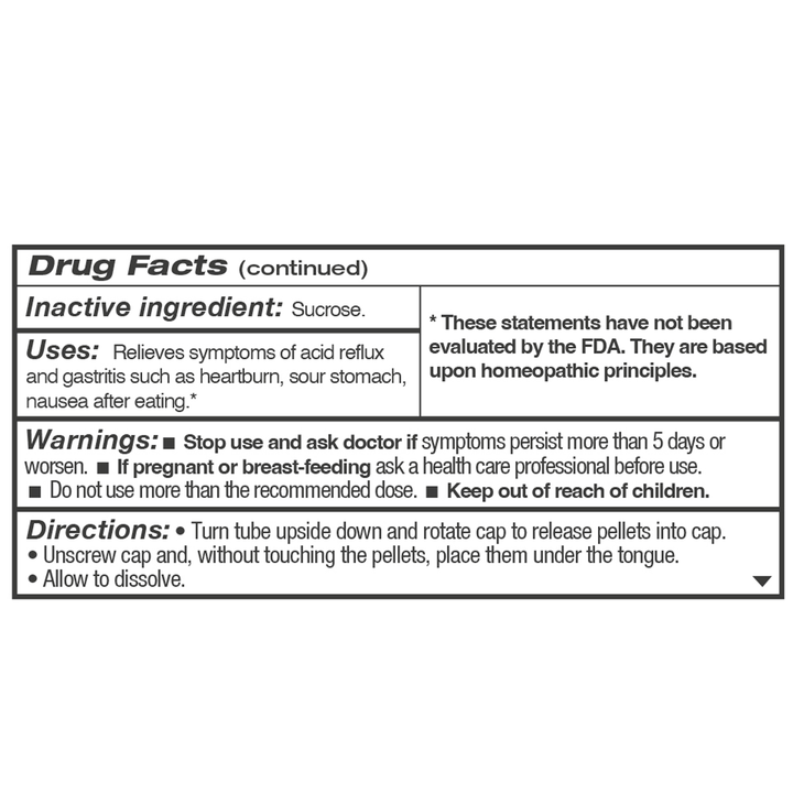 | Natrum phosphoricum 4X | Relieves heartburn, sour stomach |