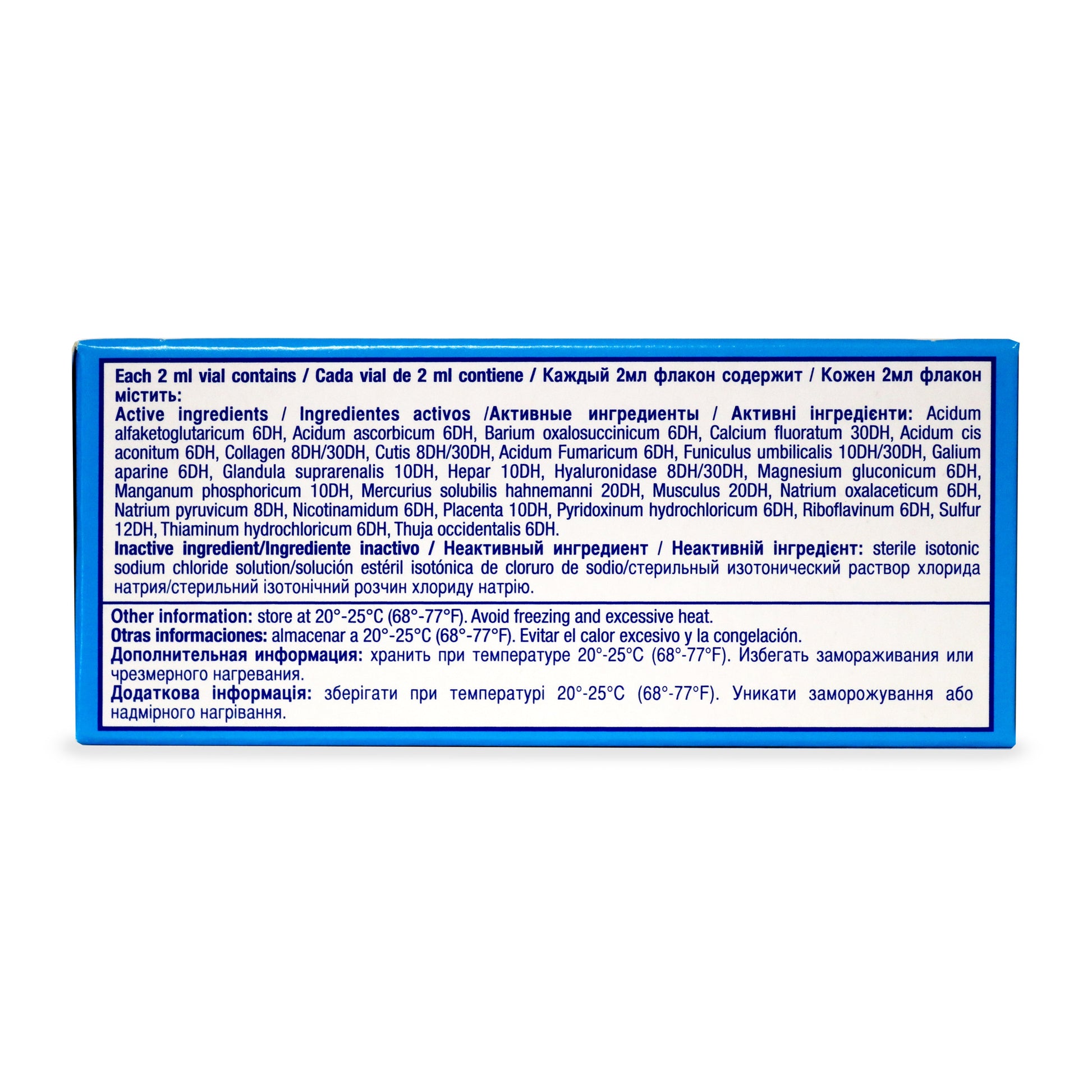 Ingredients: a-Ketoglutaricum acidum 6X, Ascorbic acid 6X, Barium oxalsuccinate 6X, Calcarea fluorica 30X, Cis-Aconitic acid 6X, Collagen, Porcine 8X/30X, Fumaricum acidum 6X, Funiculus umbilicalis suis 10X/30X, Galium aparine 6X, Glandula suprarenalis suis 10X, Hepar suis 10X, Hyaluronidase 8X/30X, Magnesium gluconate 6X, Manganum phosphoricum 10X, Mercurius solubilis 20X, Muscle tissue, Porcine 20X, Natrum oxalaceticum 6X, Natrum pyruvicum 8X, Nicotinamidum 6X, Placenta totalis suis 10X, Pyridoxinum hydrochloricum 6X, Riboflavinum 6X, Skin tissue, Porcine 8X/30X, Sulphur 12X, Thiaminum hydrochloricum 6X, Thuja occidentalis 6X