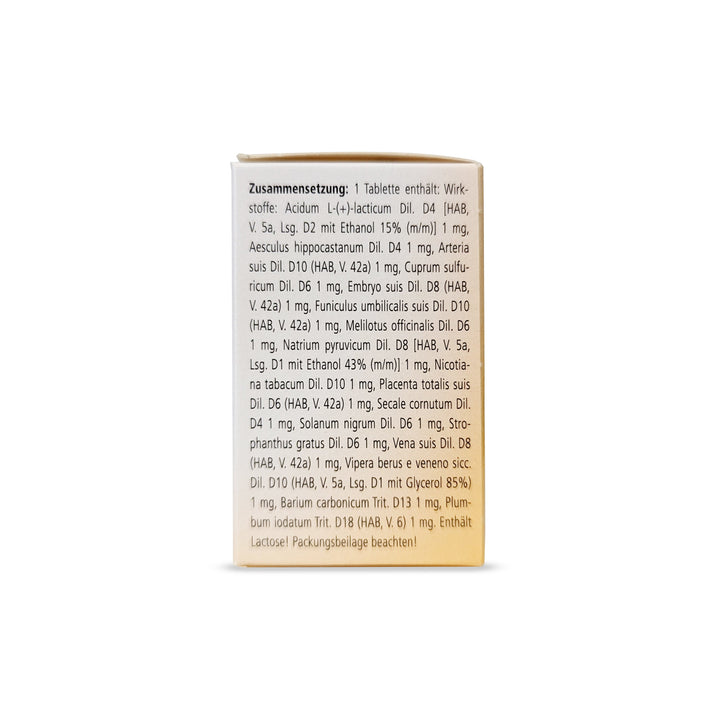 1 tablet containing: Placenta suis D6, Embryo suis D8, Vena suis D8, Arteria suis D10, Funiculus umbilicalis suis D10, Secale cornutum D4, Acidum sarcolacticum D4, Tabacum D10, Strophanthus gratus D6, Aesculus hippocastanum D4, Melilotus officinalis D6, Cuprum sulfuricum D6, Natrium pyruvicum D8, Barium carbonicum D13, Plumbum jodatum D18, Vipera berus D10, Solanum nigrum D6 1 mg each.