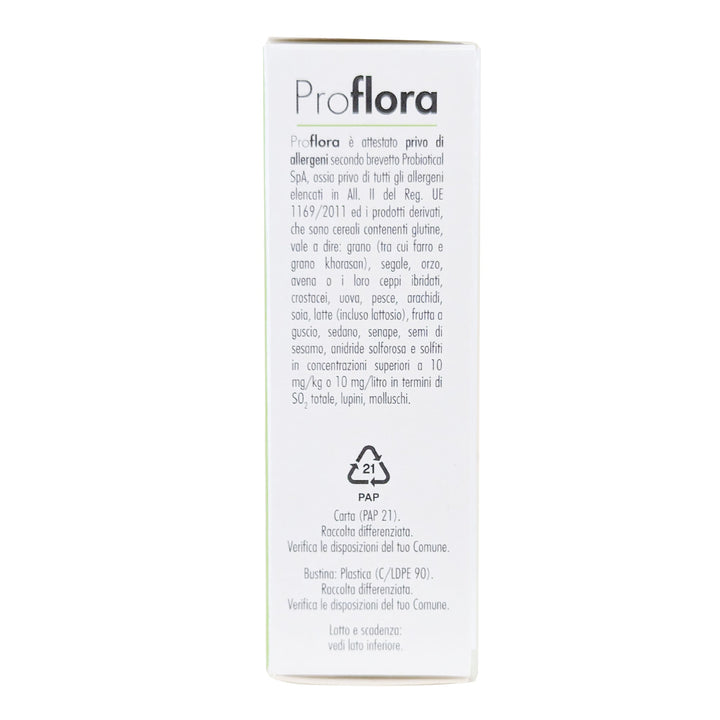 Proflora is allergen free tested, by using a method patented by Probiotical S.p.A., according to current legislation (Annex II Reg. EU 1169/2011) for the following allergens: wheat, rye, barley, oats, spelt, kamut and kamut-derived strains, shellfish and shellfish products, eggs and egg products, fish and fish products, peanuts, soy and soy products, milk and dairy including lactose, nuts, celery, mustard, sesame seeds, lupins, mollusk and mollusk products, sulfur dioxide and sulphites at concentrations higher than 10 mg/kg or 10 mg/l expressed as sulfur dioxide.