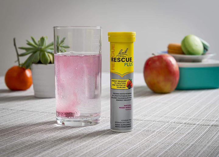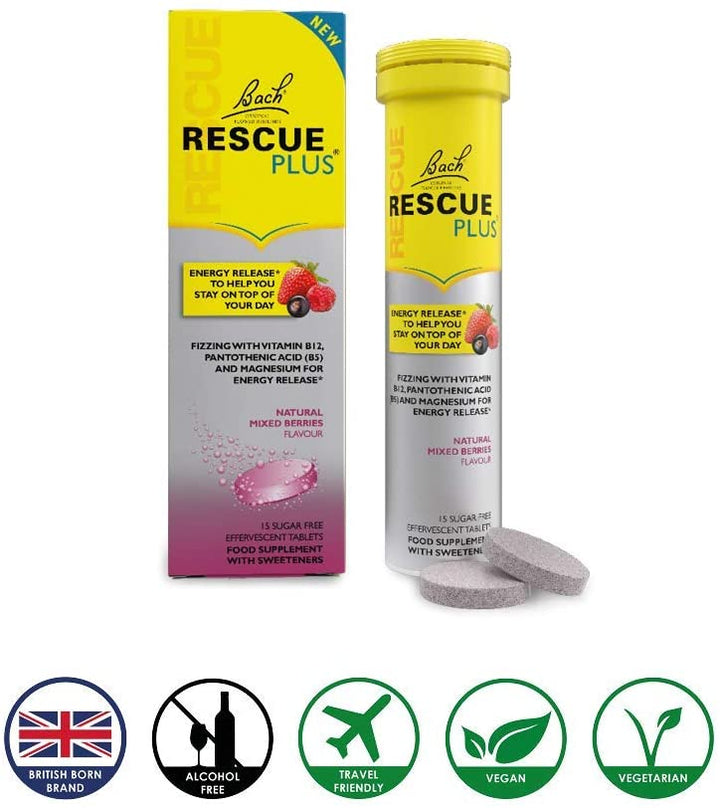 - Each RESCUE Remedy PLUS effervescent tablets contain four drops of the original RESCUE tincture - Dr. Bach's famous combination of five natural flower essences, hand-picked from his original gardens in the UK plus vitamins B12, B5, magnesium, and zinc
