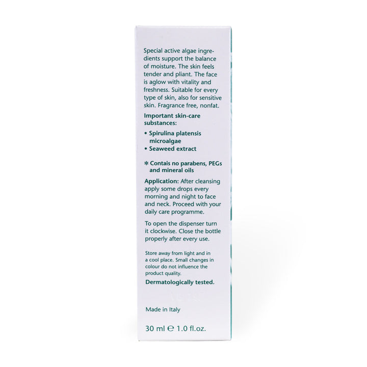 The pure, non fatty gel with an effective complex of active ingredients of spiru- lina platensis microalgae and seaweed extracts provide the skin with long-term moisture. The unique formula supports elasticity and balances moisture. After a few applications only, the skin already looks more vital, smoother and softer. The face gets new freshness and a soft appearance.