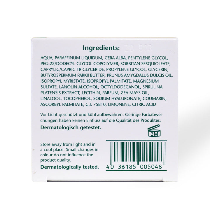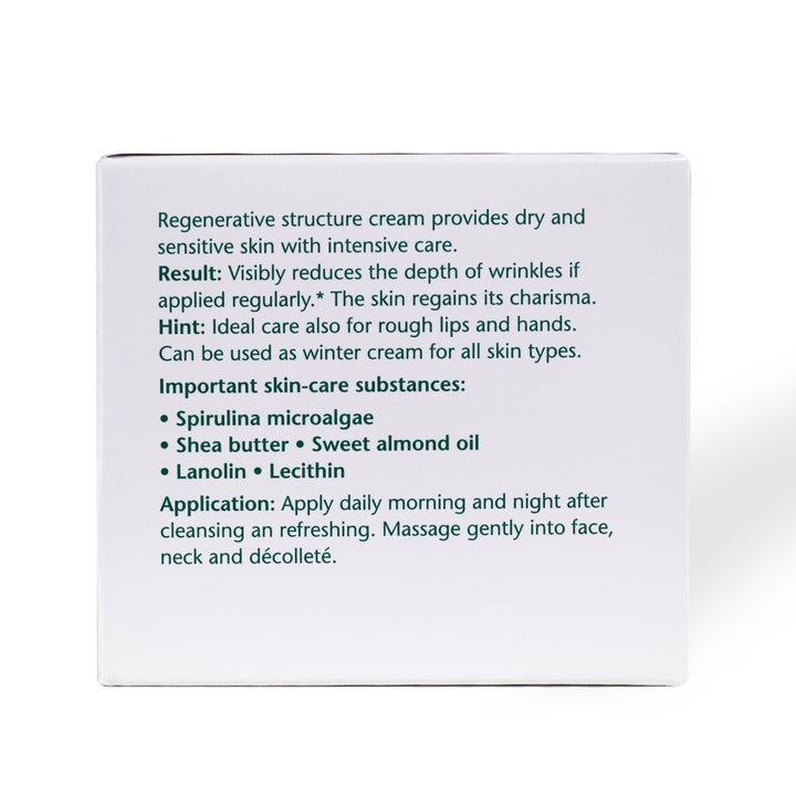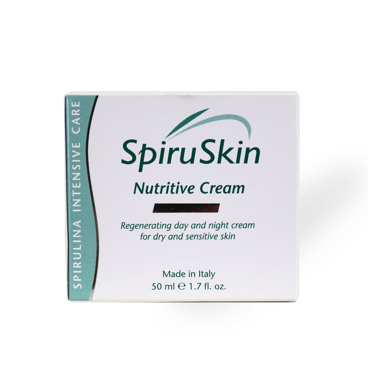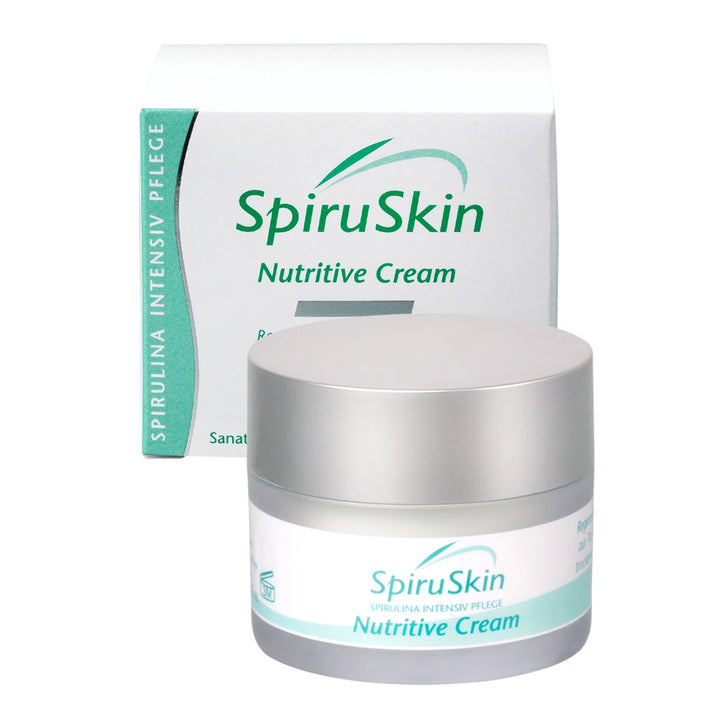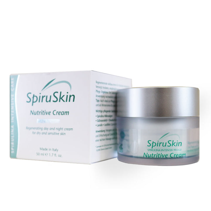 SpiruSkin Nutritive Cream supplies extensive care especially for dry, sensitive skin. Spirulina platensis microalgae, moisture giving substances and lecithin - a natural liposome creator - provide sensitive and stressed skin with intensive care. Sweet almond oil, shea butter and lanolin remove dryness and the sensa- tion of tenseness.